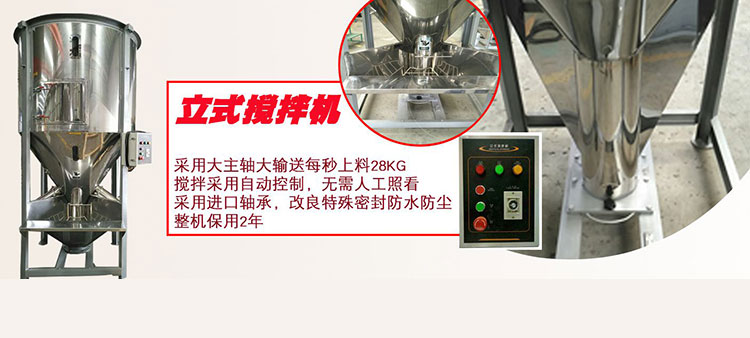 本公司專業(yè)生產塑料烘干機、攪拌干燥機、立式拌料機、塑料拌料機、塑料攪拌機、立式攪拌機、塑料混料機、不銹鋼攪拌機、螺旋上料機、彈簧上料機、粉體攪拌機、臥式攪拌機、食品上料機、攪拌烘干機、塑料拌料機、立式混色機、塑料混合機、大型立式攪拌機等注塑機周邊設備。我司經過多年的努力和研究,在攪拌粉末料這方面有了重大的突破。引得了很多客戶的肯定,特別是在國內市場備受歡迎。